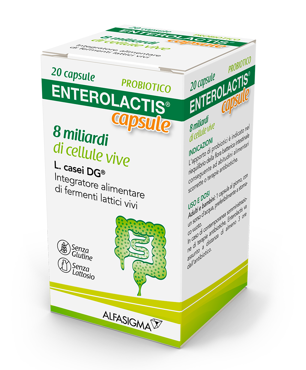 ENTEROLACTIS® 20 Capsule contiene NON MENO DI 8 MILIARDI di L. casei DG per capsula. È un fermento probiotico idoneo a colonizzare adeguatamente il lume intestinale e equilibrare la flora microbica intestinale alterata.